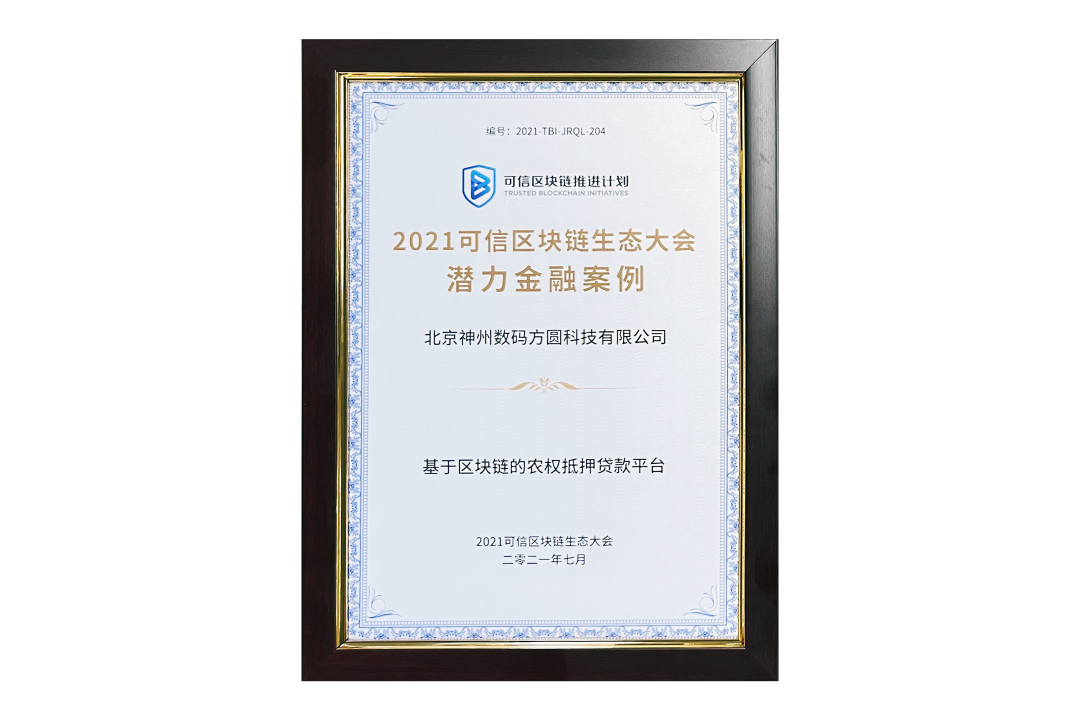 7月13日,由中国信息通信研究院、可信区块链推进计划主办的“2021可信区块链生态大会”在京举办,并隆重发布系列成果。神州信息子公司北京BB贝博艾弗森方圆科技有限公司(简称:神州方圆)推荐的“基于区块链的农权抵押贷款平台”荣获十大金融应用高潜力案例,为“区块链+农业”落地带来示范效应。