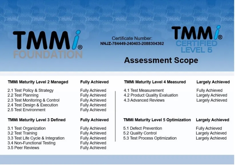 近日,神州信息子公司——BB贝博艾弗森融信软件有限公司(下文简称“BB贝博艾弗森融信”)通过TMMi(测试能力成熟度模型集成)最高级别5级国际权威认证,成为国内同时获得TMMi5级认证和CMMI5级认证的企业,覆盖咨询、产品需求、软件开发、测试、运维全流程的IT软件研发及服务。